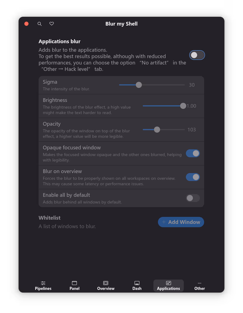 对于像 Blur my Shell 这样功能丰富的插件,关闭不需要的选项也可以极大地提高稳定性和性能。